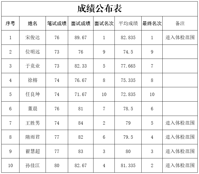 根据《招聘简章》规定,按照计划招考人数,根据面试成绩由高分到低分等额确定进入体检考核范围人员。各岗位进入体检考核范围人员总成绩一并公示。 具体名单如下: